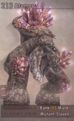![]() | FF12 (ENEMY) -Atomos (mark) Although it doesn't look anything like the previous versions, there is a mark called Atomos. CP: Being a mutant Slaven, its body encrusted with all Manner of precious Crystals. With the passing of Months and Years, the Impurities in these Crystals are gradually absorbed by the Creature, purpling their natural Ochre Hue to beautiful Effect. These Crystals are traded for a high Price, making their Bearers the Target of much Over-hunting by Soldiers tasked with acquiring Funds for Archadia's War Effort. So have these Slaven learned to fear and attack Men, and for this Reason was a Bill for this Mark posted. |