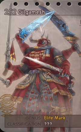 ![]() | FF12 (ENEMY) -Gilgamesh Gilgamesh returns as a "Man of Mystery" in a special hunt offered by Montblanc. The Hunt is titled "Battle on the Big Bridge" (the same as the title of his theme track in FF5) and in fact does take place on a bridge in the Lhusu Mines, and he again has his sidekick Enkidu (with a vastly different appearance). He even has his theme music back! After beating him once, he runs away, leaving a replica of the Wyrmhero Blade behind, which he quickly yanks back when your party leader's back is turned. He shows up once more during a fishing sidequest, where he gives you a fishing rod called the "Matamune". He has an obsession with weapons, and is apparently searching for one more ultimate weapon - most probably the Masamune, the best katana, which you actually get as a reward from Montblanc for beating him. As a series first, Gilgamesh has a voice: John DiMaggio, better known as Wakka and Kimahri from FFX, and Migelo from FF12. CP: An ancient Man of Mystery, traveling the Dimensions with his lone Companion, Enkidu, in search of a legendary Sword. It is said he confronts all Adventurers he meets and challenges them for their Weapons. Each of his six Arms bears a Weapon of great Fame, yet there is no Evidence that any are the genuine Article. Petitioned as a Mark by a Swordsman bereft of his beloved Blade. |