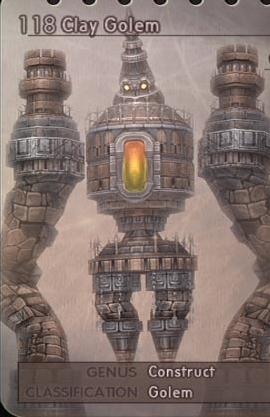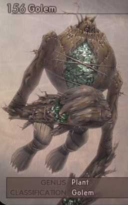 ![]() ![]() | FF12 -Golem -Treant -Clay Golem -Mythril Golem -Babil -Tower (rare) -Juggernaut (rare) -Goliath (mark) -Roblon (mark) CP: Being a great, soulless, vegetative creature that supports its mass and moves about by means of extraordinarily long arms. Said to be the manifestation of tree spirits, from trees burned down on battlefields, golems are peaceful by nature, though they suffer no intrusion upon their territory. They are as strong as their life-trees were old, so old that some are already in advanced stages of petrifaction even as they stand. |